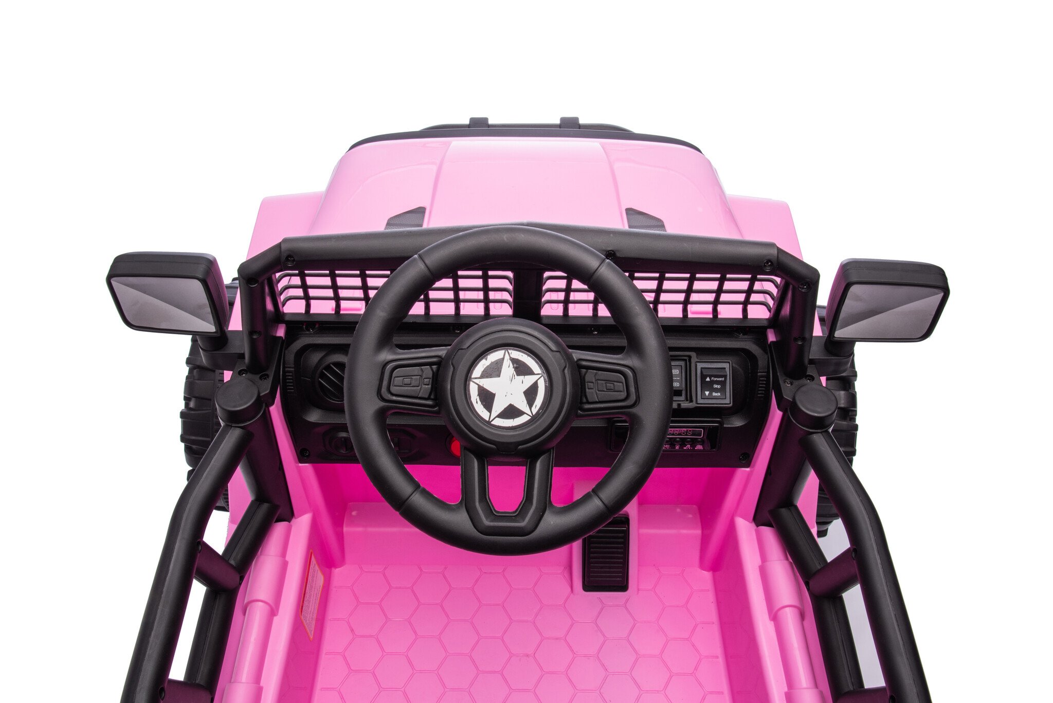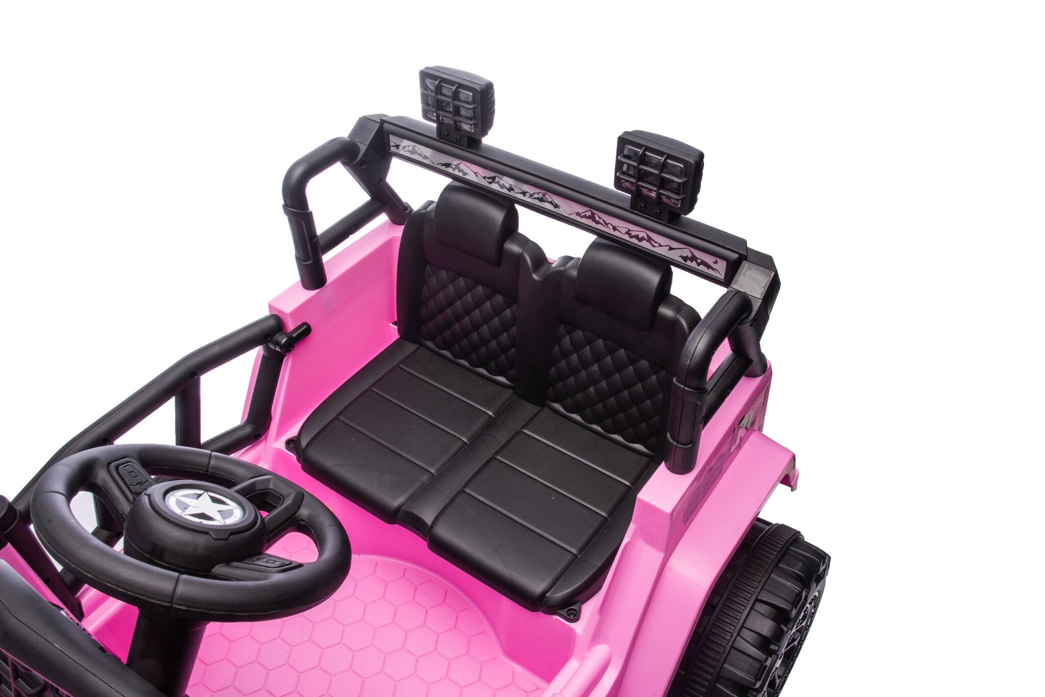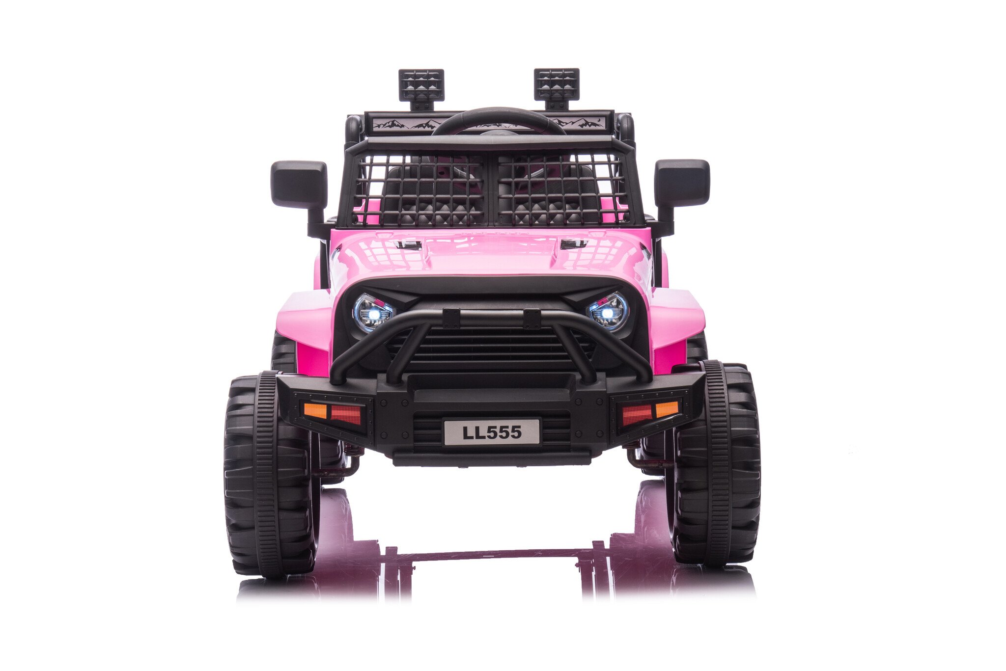 This pink children’s car is equipped with two powerful 12-volt motors and has three adjustable speeds between 2 and 5 km per hour. With its “soft start,” children won’t feel any jolts when accelerating. The car also features a lap belt, sprung wheels, two real doors, working LED lights, dashboard lighting, and a USB, MP3, and mini SD input for playing your own music.